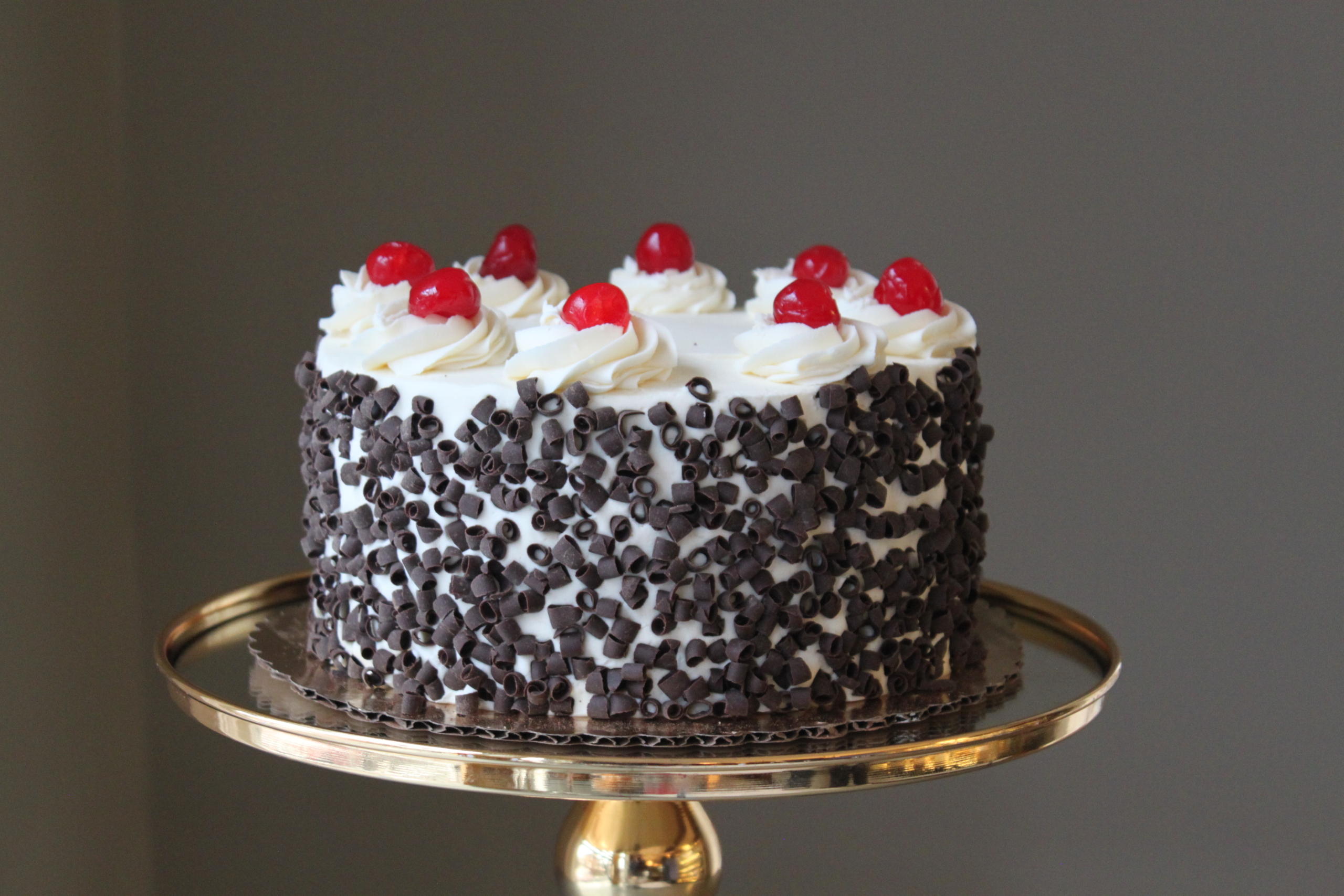 Chocolate cake layered with white icing and filled with cherry filling. Decorated with chocolate curls on the outside, and topped with maraschino cherries.