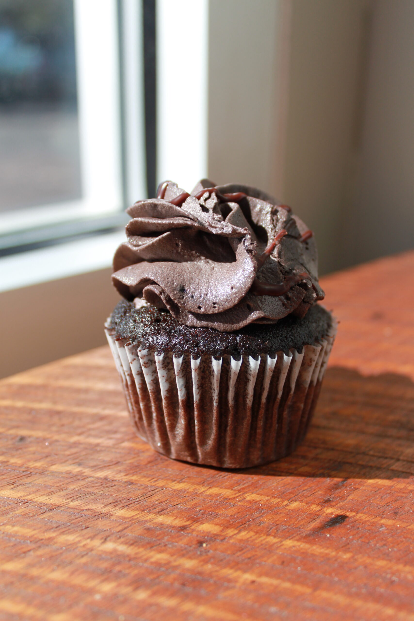 Chocolate cake with chocolate icing, topped with chocolate curls.