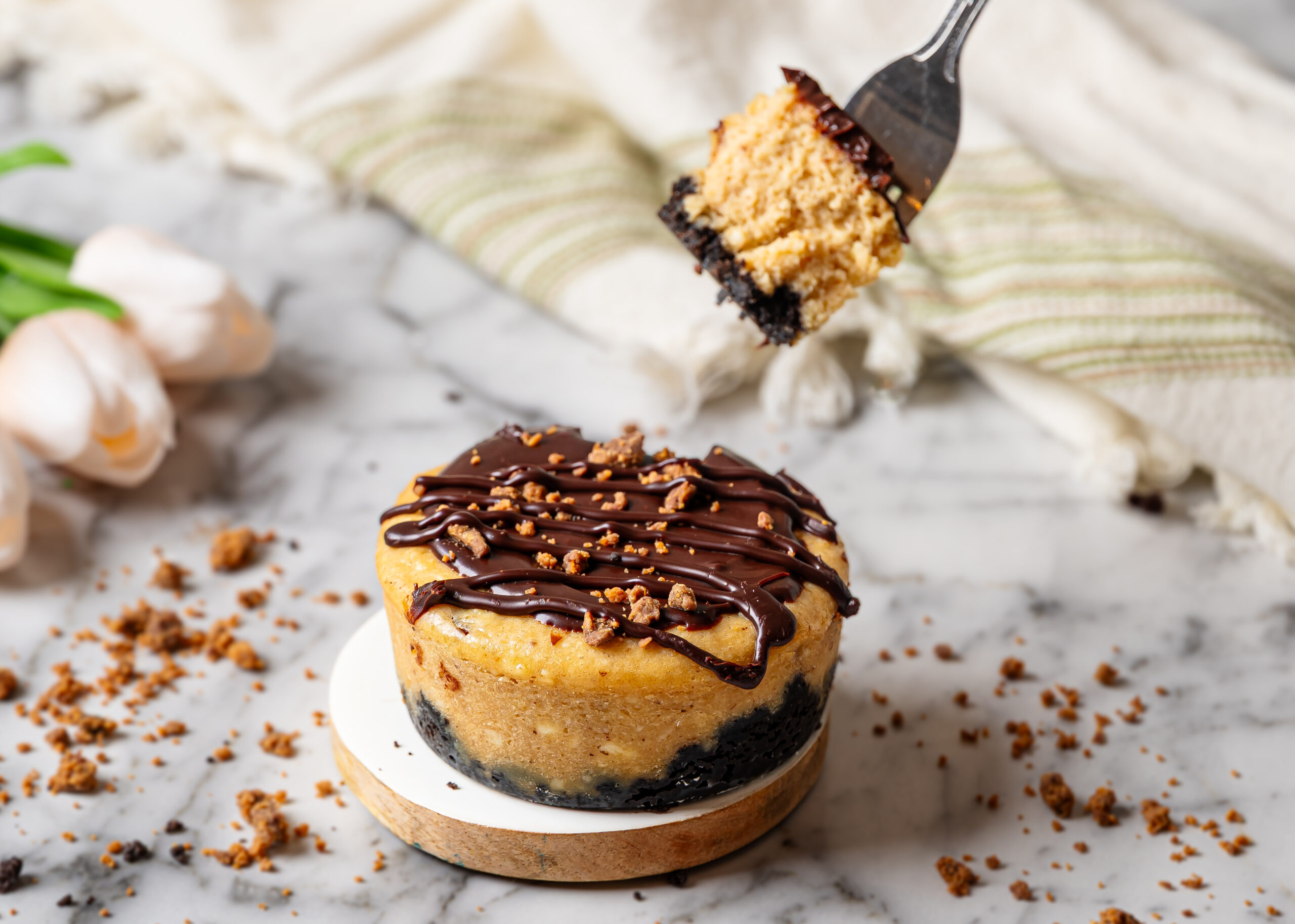 Chocolate Peanut Butter Cheesecake topped with Chocolate Ganache & Drizzle – Individual Size Cheesecake