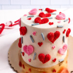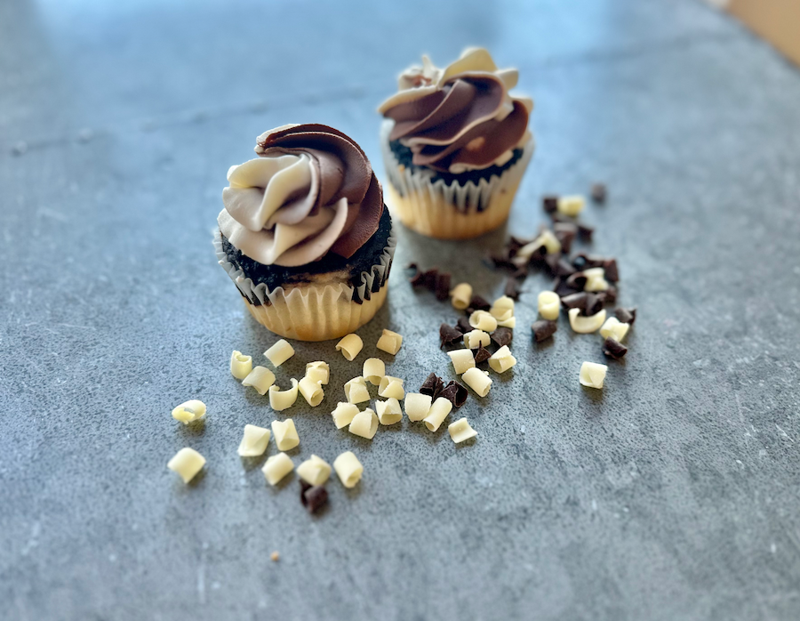 White and chocolate cake, topped with white and chocolate icing flowers