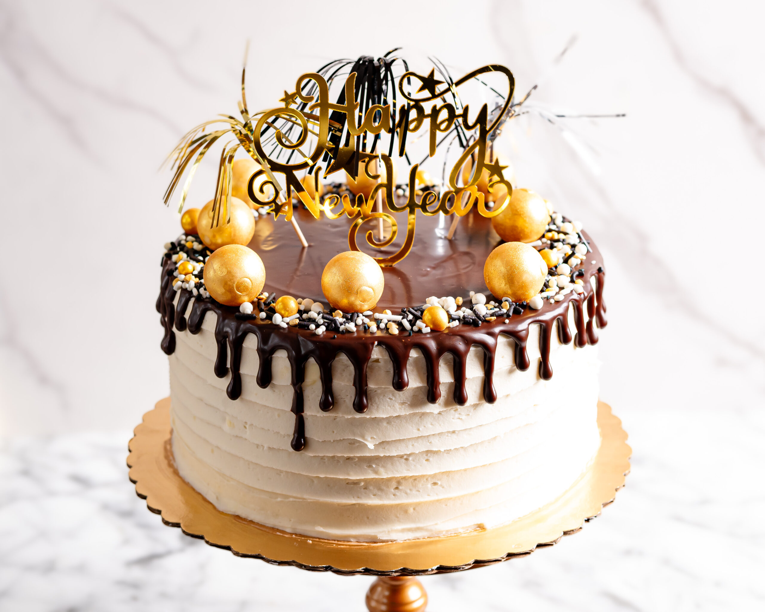 Decorated as pictured. Chocolate cake white chocolate mousse filling, white chocolate icing topped with gold white chocolate truffles, sparklers & a Happy New Year sign.