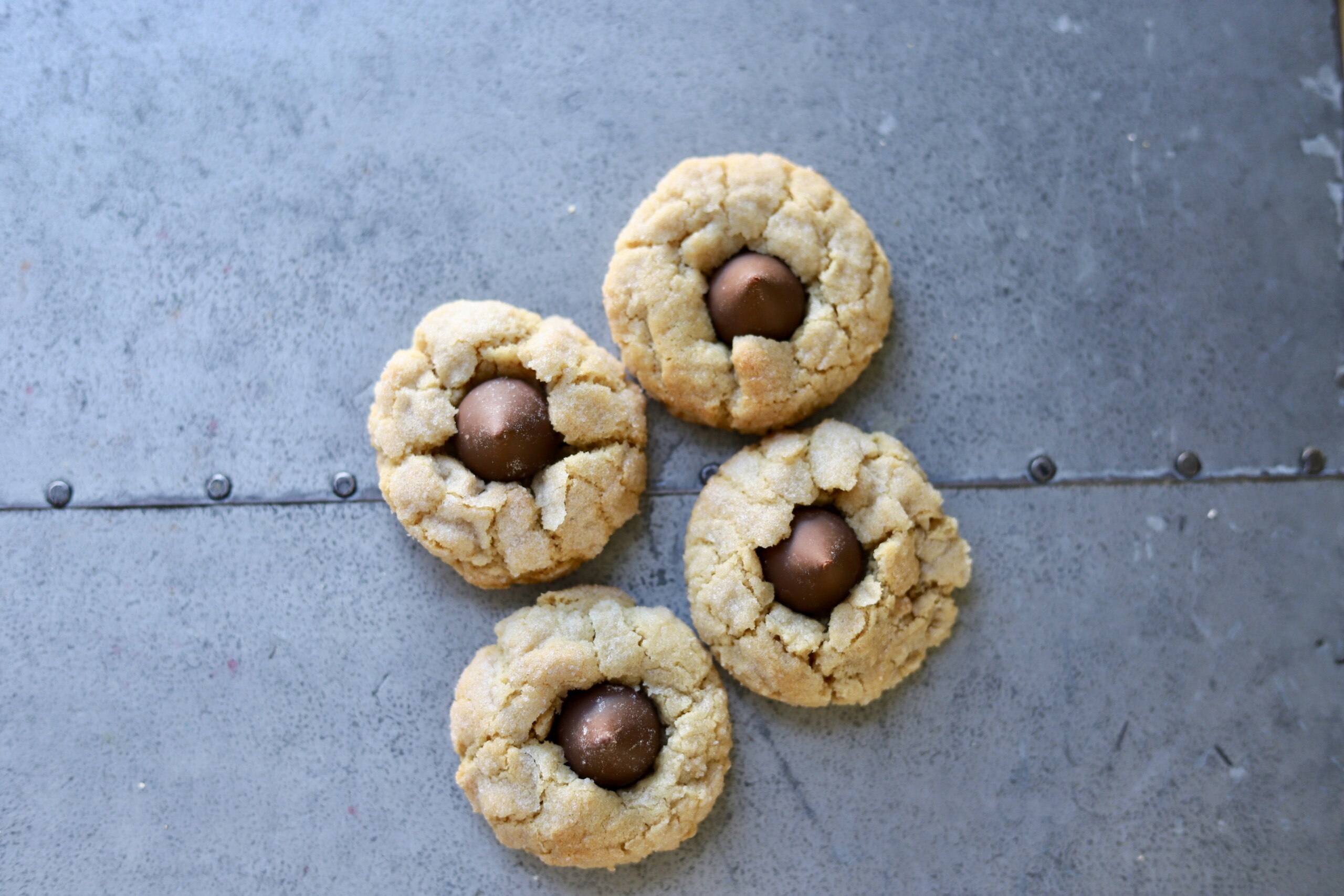 A peanut butter cookie rolled in granulated sugar, topped with a Hershey’s kiss.