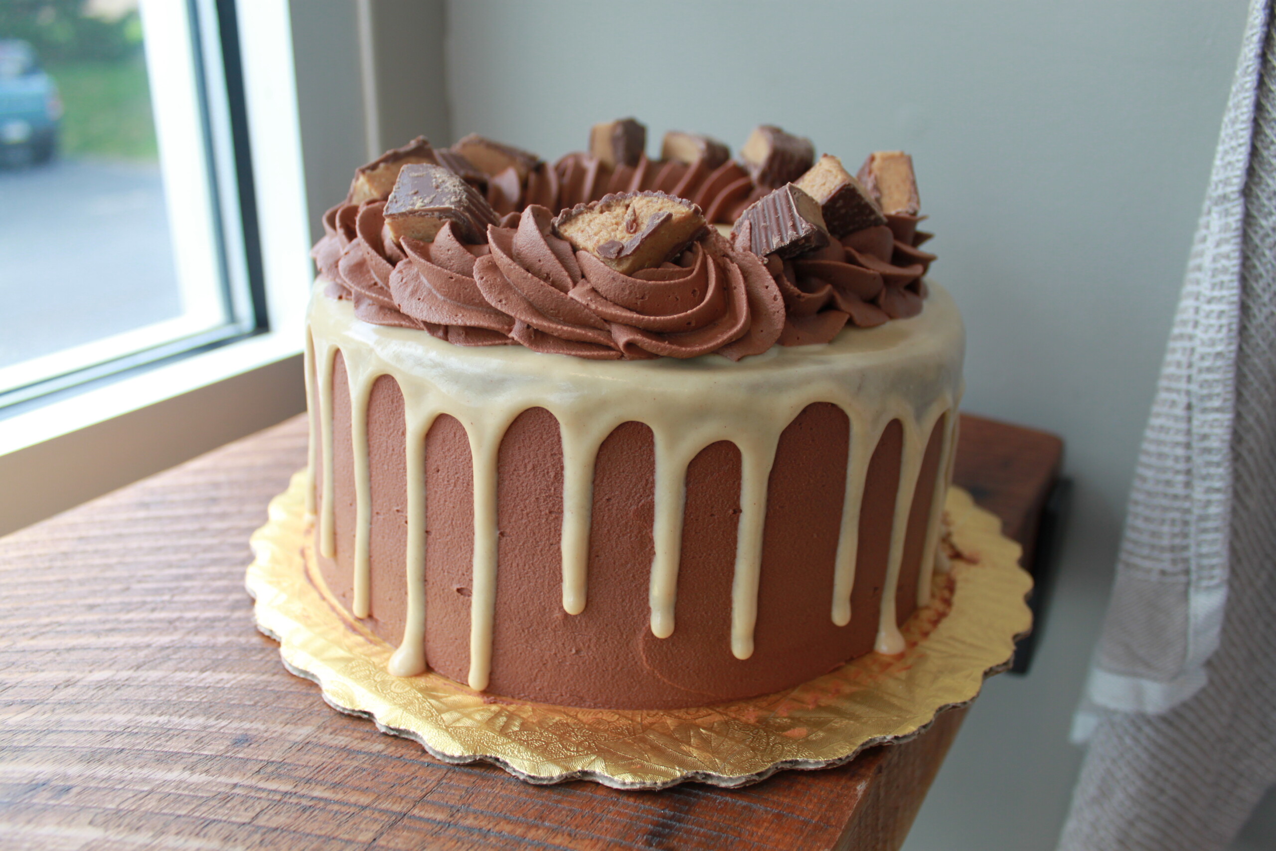 Peanut butter cake with milk chocolate icing, topped with peanut butter ganache and peanut butter cups.