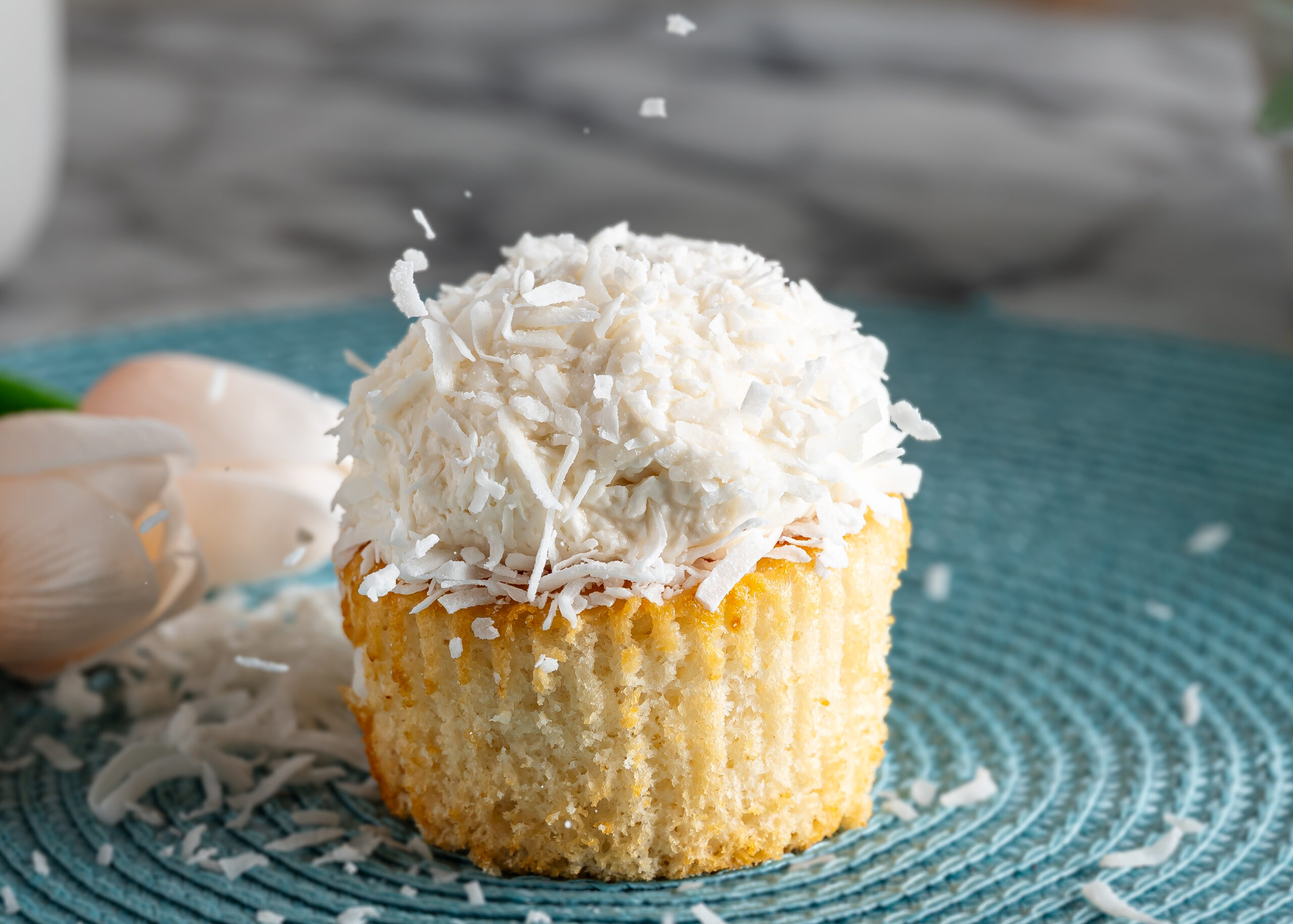 Vegan White Cupcake with Coconut Icing covered in Coconut Shavings