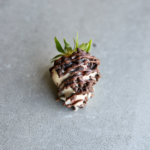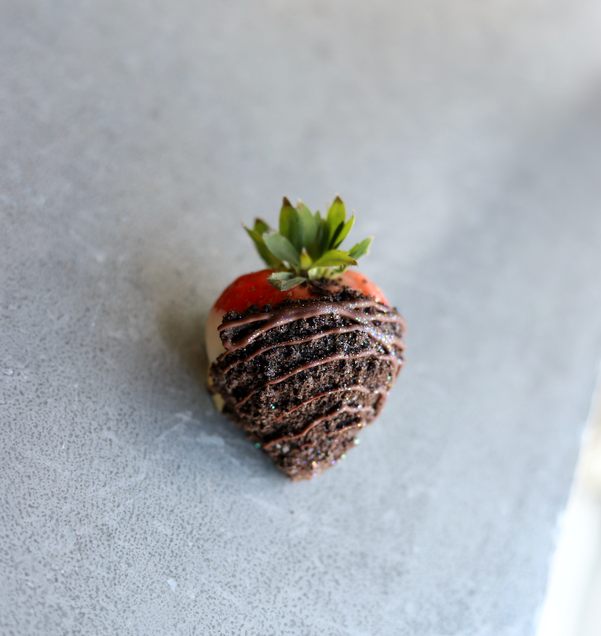 White Chocolate covered strawberry garnished with Cookies & Cream Crumbles.