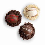 The White Opera Fudge Bomb has a vanilla cookie crust with a molten chocolate lava cake. Topped with opera fudge, dipped in white chocolate. Garnished with which chocolate shavings and drizzled with a while chocolate.